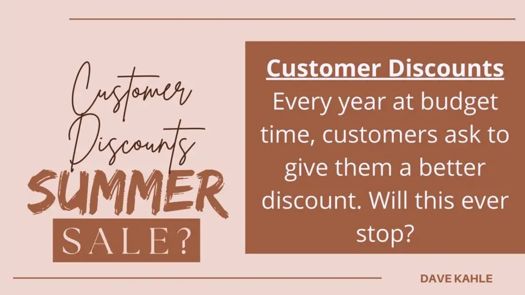 Q. Customers ask every year at “budget” time for us (as their main distributor) to give them a better discount. Will this ever stop? A. No. Q. How can we continue to grow when we keep giving away margin?  A...